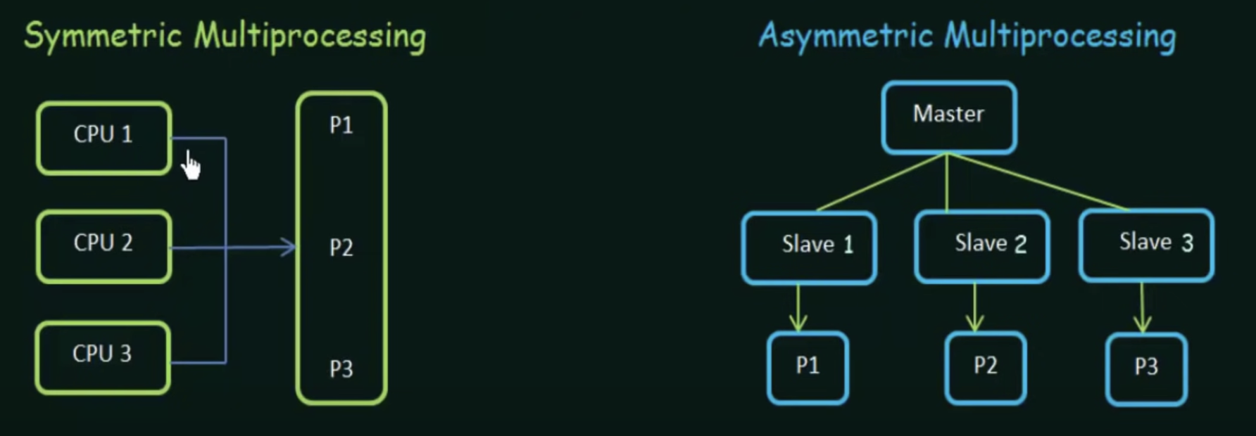 - Asymmetric Muliprocessing: One CPU acts as the master, others as slaves. Master assigns tasks to slaves to let them do their works on their own