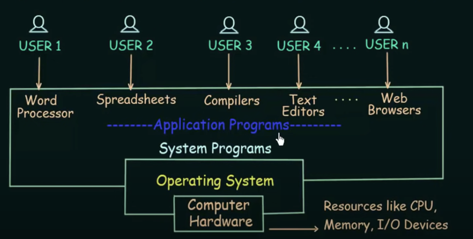 \text{User} \rightarrow (\text{use}) \text{Application Programs} \rightarrow (\text{needs}) \text{Operating System} \rightarrow {\text{(to connect to)}} \text{Hardware}